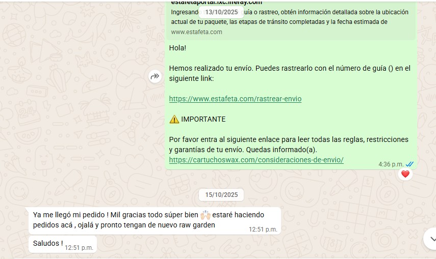 Después de recibir tu pago recibrás vía correo electrónico la guía de rastreo para que puedas dar seguimiento a tu envío en tiempo real y tengas la seguridad de que ya está viajando. Además, tu paquete viaja asegurado contra daño, robo o extravío. Y nosotros nos hacemos responsables para que no dejes de recibir tus artículos.